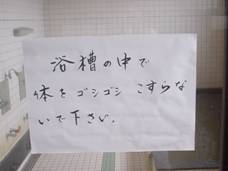浴室の入口には、「浴槽の中で体をゴシゴシこすらないで下さい」の張り紙が。「ゴシゴ