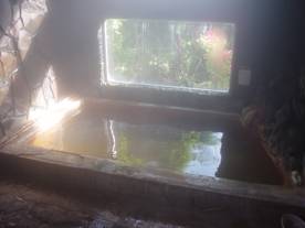 水面には「湯の華」(と思う)が浮いています。お湯の色は、黄土色で湯船の底はザ
