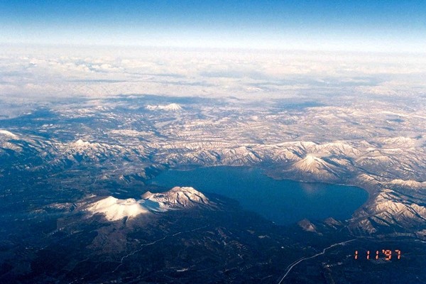 機内から支笏湖を望む 7:30に羽田を離陸。1時間ほどすると北海道の大地が見えてきた。 「左手前方に支笏湖がご覧になれます。」とのアナウンスがあった。あいにく右側の席に座っていたので、後方の 非常口そばの窓から眺めた。手が空いているのか、スチュワーデスがやってきて話し相手になってくれた。 「いつもフライトしている私たちでも、こんなにきれいな支笏湖はめったに見たことがないんですよ。」という。 ピーナツの殻のように中がくびれた形のうす青い湖が横たわっている。周囲は雪を頂き、遠くまでなだらかに連なった 山脈。道路や建物もあるにはあるのだろうが、人造物を一切拒否するかのように、太古の姿そのままだ。空は地上から 見るよりはるかに青く、いやむしろ恐ろしいほどの青さでおおいかぶさっている。冬の凛とした大気がはりつめているのが 感じられる。見る者全てを圧倒してくるような景色。 荘厳、神秘、雄大・・・そういったありきたりの言葉を完全に超越している。これを見ることができただけでも冬の 北海道に来てよかった。まだ着陸もしないうちからそう思った。 |