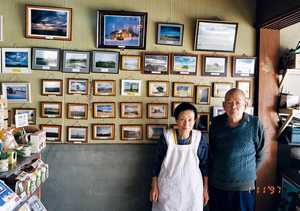 ようやくやってきた電車(マイタウン列車ラベンダー号)に乗り、美瑛の駅に降り立ったのが正午少し前だった。 この旅に出る前に、防寒靴を買った靴屋さんが、「北海道は雪が凍って歩きにくいから、着いたら靴の裏に 鋲(びょう)を打ってもらうといいですよ。」と教えてくれた。いざ歩いてみると確かに歩きにくい。ただ地元の人たちは、 全く普通に歩いているし、中には小走りの女性もいる。冬の日の歩き方でよそ者かどうかわかってしまうと思った。 駅の前を少し進んだところに靴屋があったので、片足で8か所の鋲を打ってもらった。歩きやすくはなったが、 地元の人と同じ様なわけにはいかないころばないように気をつけなければ。 やがて腹が空いてきた。駅前にラーメン屋があったので入る。中は年老いた主人夫婦だけで客はいない。 メニューにとくに珍しいものもなく、私はあまり期待せずにみそラーメンを頼んだ。美瑛→北海道の一部→札幌も北海道→ みそラーメンという安易な連想ゲームで選んだような気もする。 出てきたものは、今まで食べたみそラーメンのイメージ(こってりとした茶色のスープにチャーシューと麺が 浮かんでいる)ではなく、どちらかというと赤だしのような和風のスープにたっぷりの野菜と麺が浸ったような 感じだった。 一口すする。うまい。だしがたっぷり効いているように思えたので主人夫婦に聞くと、2日かけてスープを 仕込むとのこと。じっくり味わいながら喰った。 ふと食堂の隣の土産物コーナーを見ると、額に入ったたくさんのカラー写真が壁にかかっていた。雪景色、春の原色、 緑がいっぱいの夏の様子など様々な風景写真だった。主人にたずねると、全て美瑛の「丘」の写真だという。 知らなかったが、富良野のラベンダーの景色と同じくらい美瑛の丘の風景は全国に有名だとのこと。 この写真も、全国から丘の写真を撮りに来た人たちが、この食堂で食事をしたことがきっかけで作品をこの壁に 飾るようになったのだという。 写真の芸術性などはよくわからないが、じっくりと眺めてみると四季おりおりの(月並みな言葉だが)風景が 描かれていて、ちょっとした展覧会場のようだ。 今回は時間がないが、私もまたいつか美瑛の町に降り立って、丘の写真を撮ってみたい気持ちになった。(14.12.10UP) |