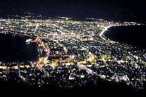 札幌から千歳線・室蘭本線とつないで、函館に着いたのは日もとうに暮れた7時ころだった。どうしても函館山からの夜景を見たくて、 宿にしたハーバービューホテルからタクシーを拾う。 路面電車の線路沿いに、ロープウェイ乗り場に向かうとき、ちょっとおもしろいことがあった。私の乗ったタクシーの目の前をほとんど 信号無視の形で横切ったバイクがあった。タクシーの運転手が気色ばんで窓を開ける。さあ、ここで、東京なら「この野郎!」、 大坂なら「どアホウ!」、博多なら「何ばしよっとか!」など土地土地の言葉で激しい罵声があびせられる場面だ。さてこの北国の 運転手さんは何と叫んだか?・・・・・・・・・・・・・・・ 「バカでないかい?」彼は、尻上がりのアクセントで何とも間延びした迫力のない 声を出したのだった。もちろん九州人の私がそう感じただけで、彼や土地の人にとってはきびしい声なのかもしれないが何となく 優しげな響きが函館の穏やかな土地柄を示しているような気がしてならなかった。 さて、ロープウェイを降りて展望台から一望する夜景は、予想通りの美しさだった。色とりどりの宝石のような無数の輝きが、 津軽湾に向かって半島状に突き出た函館市街の形そのままに、ちりばめられている。冬はとくに空気が澄んでいて、よりいっそう 鮮やかになるらしい。夢中でシャッターを切ったが、帰って現像してみると全て失敗作だった。下(左)の画像は、ネットで知り合った 「やす」さんから提供していただいたものである。(彼も何回か失敗の末にこのような見事な画像を撮れたのだそうだ。 夜景の撮影はホントに難しい。)写真でも、この夜景のすばらしさは伝わってくるが、機会があったら実物を一度見られることを お勧めしたい。 |