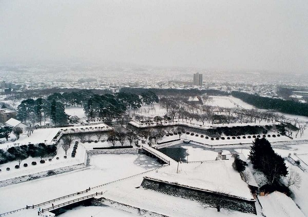 函館市内から、五稜郭へ。幕末から明治、激動の日本にわずかの間存在した幻の共和国「蝦夷共和国」のいわば都だった ところである。鳥羽伏見から始まった戊辰戦争は、函館戦争を以て終止符が打たれ、明治新政府の時代が始まる。この時代の 1枚の古写真が私の印象に残っている。降伏した榎本武揚らの助命嘆願のために、頭を丸め、そのスキンヘッドを照れくさそうに 撫でる黒田清隆の写真である。彼は五稜郭を攻めた新政府軍の司令官だった人で、後に第2代内閣総理大臣になるわけだが、 一方の榎本も後に逓信大臣などの重要ポストを歴任する高官となっている。 他のアジア諸国や欧米の歴史では、旧体制内の人物は必ず抹殺されていると私は思う。その才能を新体制下でも役に 立てようとする黒田のような人物、非難されつつも、黒田の意気に感じ、しょう然とそれを受け入れる榎本のような人物が存在する ところに、日本史のふところの深さ(批判的な人は節操のなさ、あいまいさというかもしれないが・・・・)を感じるのである。 それはさておき、雪に埋もれた五稜郭の姿はすばらしかった。五稜郭タワーから見下ろすと、幾何学的な城壁と、黒々とした 木々が真っ白な大地に刻まれ、一幅の墨絵を見ているような気がした。(15.03.07UP) |
