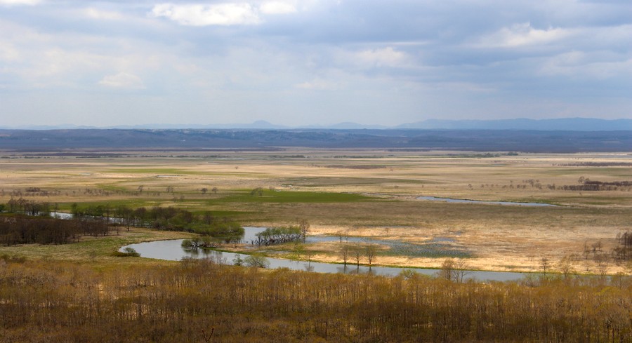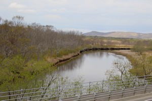 展望台の眼下には、春まだ浅い薄緑の 湿原の広大な景色が広がってました。 遅い初夏を迎えるころには、一面に深く 瑞々しい緑におおわれるはずです。 |