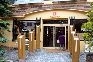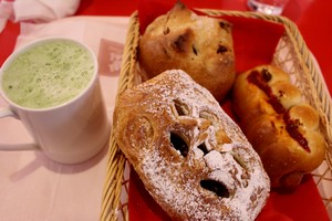 遊覧船はほぼ1時間おきに出ていて、直近は13時だったのですが、1便遅らせてどこかで昼飯を食おうと思いました。昨日の 昼食が海鮮丼だったので、今日はパン系が欲しいなと思ってうろついていると・・・「Pan de Pan」というあちら風のたたずまいの お店を見つけました。2〜3個のパンを買って湖畔で食べるのも悪くないなと思って中に入ると、何と、焼きたてをイートインできる ようになってました。ご覧の3個のパンと、抹茶オレを頼んで、昼食をすませたスエさんでした。 |