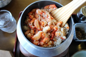 更に走り続け、車は道の駅「スワン44ねむろ」に着きました。腹も減ってきました。ここの名物は、地元で取れる花咲がにを ふんだんに使った釜飯とのこと。待つこと約20分、運ばれてきたお釜のふたをとると、ほかほかの湯気を上げながら ごらんのような炊き込みご飯が運ばれてきました。しゃもじでぷりぷりの桜色のカニの身をほぐし、ご飯と混ぜ合わせて 茶碗によそい、口に運ぶと・・・・・後は想像して下さい。 |