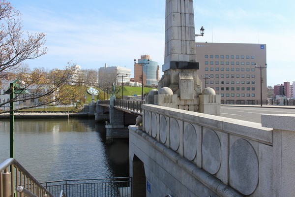 市内を流れる釧路川に架かる全長124mの幣舞(ぬさまい)橋です。四季を表す 4つのブロンズ像が橋の上に立っています。 |