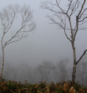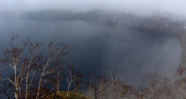 何と、霧が流れて徐々に湖が見えてきたではありませんか。ほんの一瞬でまた 湖面は深い霧に閉ざされました。それでも「摩周ブルー」といわれる深く青い 湖面の色をかいま見ることができました。晴れた日ももちろん素晴らしいと 思いますが、歌のように“霧に抱かれて静かに眠る”姿のほうが似合ってる気もします。 |