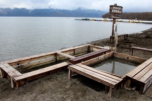 次に屈斜路湖へ。岸辺では、ちょっと 掘ると至る所から温泉水がわき出す そうです。本格的な足湯から、即席に 掘ったような湯だまりまで、色々と 作られてました。 |