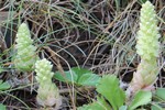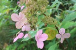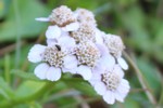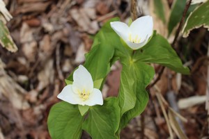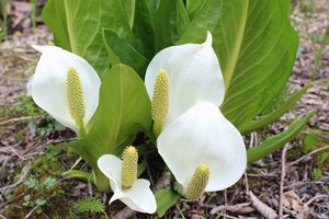展望台から湿原駅に戻る道筋には、白い花がたくさん咲いてました。左は水芭蕉 (これはすぐにわかりました)、右は何の花かわかりませんが、可憐な花でした。 |