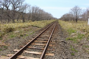 海沿いの道路は延々と続いています | 途中から山のほうに入り、初田牛(はった うし)という無人駅に立ち寄りました。根室 本線が東に向かって真っすぐにのびて います。 |
