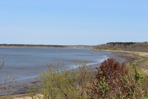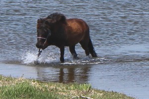 牧場の馬でしょうか。たった1頭で なんと水辺の中ををノンビリと歩いて 渡ってました。 |