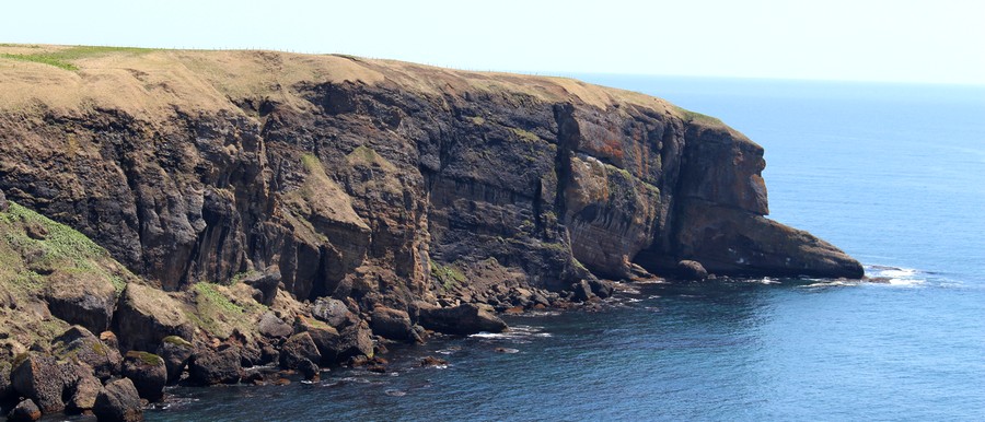 「北の大地、釧路・納沙布殺人紀行 最果ての海に美女は何を見た?」2時間ドラマのラストシーン・・・船越栄一郎刑事が、 海に飛び込もうとする殺人犯の美女に、「待て、バカなまねをするんじゃない!」と呼びかけるような断崖絶壁です。 |