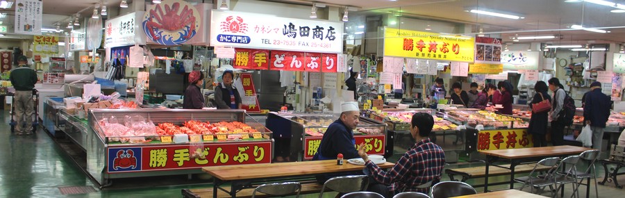 釧路駅に戻り、ノロッコ号をおりたらもう午後1時をまわってました。さて、どこかで昼飯をということで釧路観光協会のパンフを 見ていたら、「和商市場の勝手丼」という文字が目に留まりました。写真を見るといわゆる海鮮丼なんですが、ここのは、客が 自分で海鮮類を選んでトッピングできるとのこと。駅から歩いてわす゜か数分で着きました。普通に魚介類を売る市場なのですが その一角に勝手丼コーナーがあり、数件の店が、1回分の小さなトレイに何種類もの新鮮な魚、貝、エビ、カニなどを並べて います。 まずどんぶりにベースとなるご飯をよそってもらいました。酢飯と普通のご飯の2種類があり、私は中盛りのご飯に しました。まず、マグロ、イクラ、シラウオをのせてもらい、あと店の人おすすめの地元の魚を数種類、それからこれはぜひ 食べたいと思ったのが、根室であがる花咲がに・・・十種類前後のネタを乗せたどんぶりは、とうとうご飯がまるっきり見えなく なりました。。 “ひょっとしたら3000円超えてるかな?ちょっと高い昼飯になったかな”と思って勘定をしてもらうと、何とこれだけ盛って、 1600円ちょっとでした。醤油、わさび、味噌汁を添えてもらい、近くに用意されたテーブルでかきこむと、うまいのなんの・・・ 今朝東京のホテルを出るとき、サンドイッチだけの朝食だったので、腹にストンと収まりました。 |