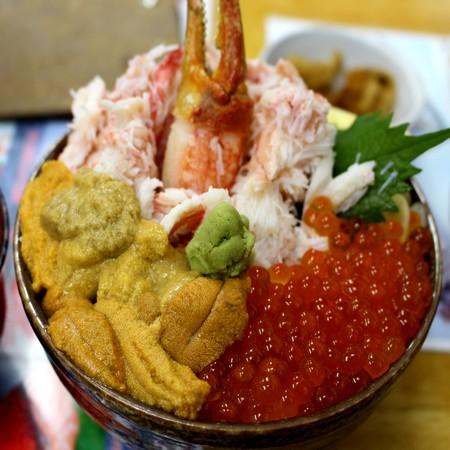 小樽駅前の三角市場(敷地と屋根がともに三角形なのでこの 名前が付いたそうです)で、ご覧の海鮮丼を昼飯にしました。 うに、カニ、いくらがドーンと乗って、ご飯は一切見えません。 これで、何とたった2000円程度なんです。味はというと・・・ ムフフフ・・・わかりますよね。 |