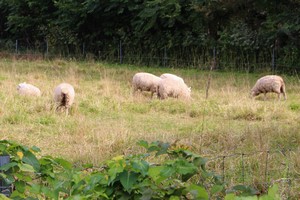 放し飼いの羊。「羊群声なく牧舎に 帰り、手稲の嶺、黄昏こめぬ」という 寮歌の一節が心に浮かぶ風景です。 |