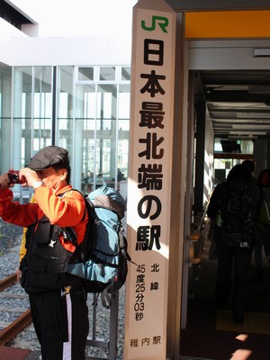 さて、滞在4日目は、特急スーパー宗谷で、札幌を朝7時48分に出発。函館本線そして宗谷本線を北上し、稚内にお昼 12時53分に着きました。途中の駅以外は、わずかに点在する牧場と山林ばかりでした。かつて取材のためにこの区間を 旅した司馬遼太郎さんが興味深い一節を残しています。今回と同様、札幌発稚内行きの列車内での、車掌さんとの会話です。 車掌:このあたりから人が住んでいません。 司馬氏:人が住んでいないとは? 車掌:(列車が)故障して長時間停車すると、食糧がなくてこまるんです。ですからJRになるまでは、 カンパンなど非常食をもって乗務したものでした。 司馬氏:JRになって、食糧を持たずに乗務できるようになったというのは、どういうわけですか? 車掌:車内に自動販売機がおかれたからです。 (街道をゆく/オホーツク街道編) 北海道の他のほとんどの地名と同様に、稚内という名前もアイヌ語からきていて、ワッカ=飲み水、ナイ=川・・・ 「飲み水の川」という意味だそうです。何でも、この周辺は昔から水質が悪くて飲料水の確保に苦しんだらしいのですが、 唯一、きれいな水が流れている小川を持っていたのが、稚内だったそうです。 5時間の列車旅はさすがに疲れました。ホームへ出てみると、札幌より肌寒い気がしました。まだ9月なんですが。 |