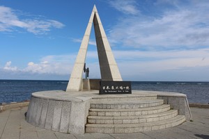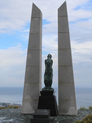 ここから1日とんで北海道滞在最終日の6日目です。(5日目は、Cの利尻・礼文に行きました。) この日は観光バスに 乗り、いよいよ最北端の宗谷岬周辺に行ったのですが、その前に高台にある稚内公園の氷雪の門(下の写真左)を訪ねました。 太平洋戦争末期、沖縄のひめゆりの塔と同様に、樺太(サハリン)で起きた若い女性の悲劇を伝える北のモニュメントです。 北の海に向かってちょうど手を合わせるような2本の建造物の間に、嘆き悲しむ表情の女性の像が立っています。 そしてその像の向こうには、天気がいいと樺太を望むことができます。私は、かの島を絶対にサハリンと呼びたくは ありません。あくまで樺太です。樺太も、北方4島と同様に、火事場泥棒的に盗まれた日本の領土だと思うからです。 |