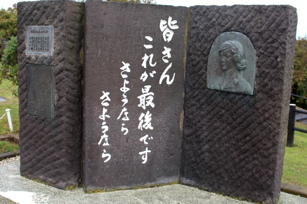 「太平洋戦争末期といいましたが、正確には、太平洋戦争終了直後の悲劇です。昭和20年8月15日に 我が国が降伏したにもかかわらず、降伏直前に参戦したソ連軍はその後も侵攻を続けました。この戦いの さなか、樺太の真岡で最後まで電話交換業務に従事した9人のわかい女性たちが、「皆さん、これが最後です。 さようなら、さようなら」というメッセージを残し8月20日に服毒自殺して殉じました。彼女たちの名を刻んだ碑(右)が 胸を打ちます。このほかにも、各地で火事場泥棒を相手にするような無残な戦いが繰り広げられ、多くの人々が 殺され、傷つけられ、財産を奪われて追い出されました。氷雪の門の女性像は、当時の樺太在住者が受けた苦しみ、 悲しみを今なお伝えています。 |