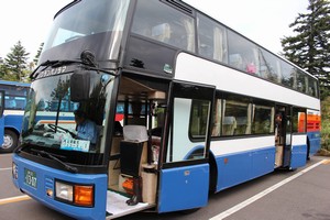 利尻まで1時間40分の航海です。 | 玄関口の鴛泊(おしどまり)港には、 島内観光のバスが待ってました。 |