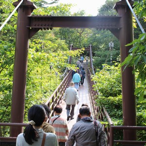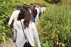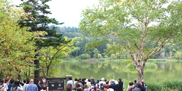 まず最初に港に近くにある一周約1kmの湖「姫沼」へ。原生林に囲まれた散策路は、一列に並ばないと歩けなませんでした。 | ||||