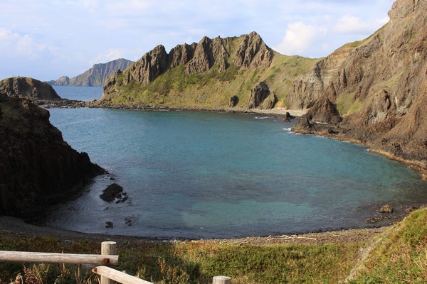 ![]() 礼文島の西北部にある澄海(スカイ)岬。やや小高い丘を登り切ると、目の前に エメラルドグリーンに澄み切った入り江が広がっていました。名前のとおり 海底まで見通せる透明度の高い海水が切り立った崖に囲まれていました。 |