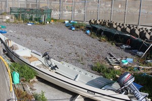 島内のいたるところに名物の昆布の 干場がありました。シーズンオフの今は ただの砂浜の空き地にすぎません。 |