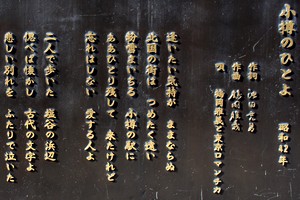 運河の散策路に、懐かしい歌の歌碑が ・・・。中学生のころ、ロマンチカが歌った ムード歌謡の名曲「小樽のひとよ」。 |
