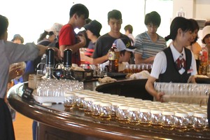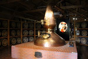 試飲コーナーでホロ酔いに | 大きな蒸留器とニッカのシンボルロゴ | |