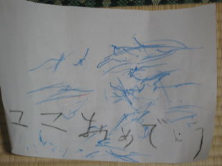 | 「ママおめでとう」はばあばと一緒に書いたみたい。青いのは魚だそうです。こうちゃん、ありがとう! | |