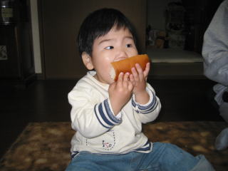 | 入院中に外泊許可をもらって帰ったときです。こうちゃんはジャリパンが好きで、この時もクリームばかり食べていました。まだ風邪もひかず元気な時です。 | |
