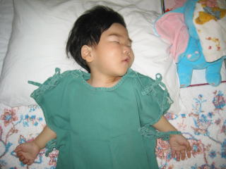| 手術室に入る前のこうちゃんです。お薬でぐっすり眠っています。このときすでに胸がゼロゼロいっていました。 | |
