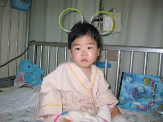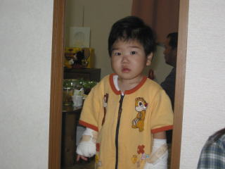 | 術後のこうちゃんです。熱も咳もありでずっと機嫌の悪いこうちゃんでした。おまけに点滴もついているし・・・。これで甘えがひどくなってママは本当に大変でした。頭の飾りは仲良くなった女の子からもらったものです。ミッキーみたいでかわいいでしょう。 | |