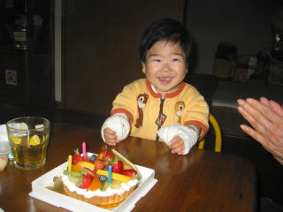 | こうちゃんの退院祝いをしました。ケーキのろうそくの火を消して喜んでいました。 | |