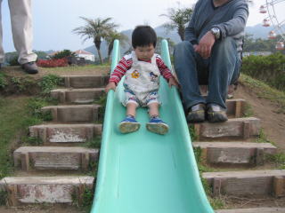 | 小さい滑り台を見つけて滑りました。こうちゃんは滑り台が大好きです。 | |
