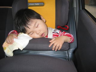 | 木彫りのゾウにも乗りました。でももう眠くてたまりません・・・ | |