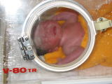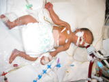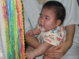 | 術後のこうちゃんです。全身がむくんでとても痛々しいです。この頃パパは毎週ママのおっぱいをこうちゃんに運んでくれました。 | ![]() |