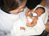 産後2週間ぶりにこうちゃんに会えました。この時ママは初めてこうちゃんをだっこしました。涙があふれてとまりませんでした。 |