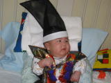 初めての端午の節句は残念ながら病院で過ごしました。おばあちゃんが買ってくれた陣羽織と烏帽子できめてみました! |