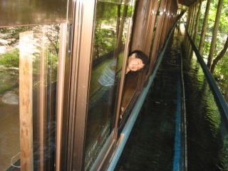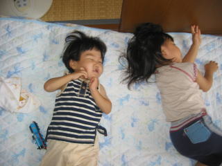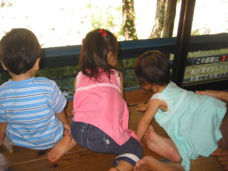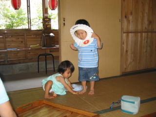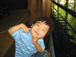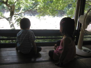 | 綾に遊びに行きました。船が運んできてくれるという鮎料理を食べに行きました。この向こう側は川です。(この写真、ちょっと暗いけどなんだか風情がありません?こうちゃんとりおちゃんです。) | |