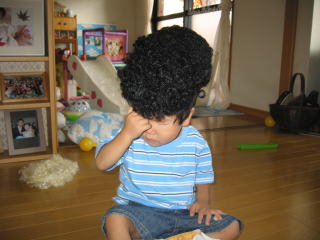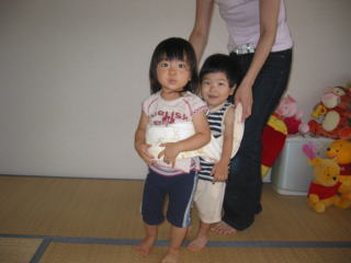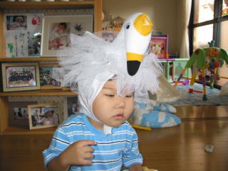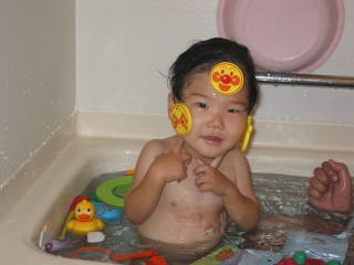 | なぜかシャンプーハットを顔にはめて、「がおー!」っとライオンの真似をしていました。そしてこうちゃんの後をそらちゃんが付いてまわっていました。 | |