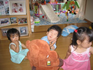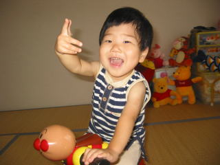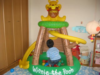 | そらちゃんのおうちに遊びに行きました。こうちゃんはこのプーさんのボール入れがお気に入り!我が家にもほしいところだけど場所とるしなあ・・・。 | |