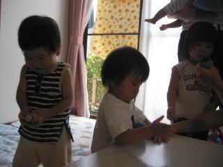 | 両手に花!花!だけど本当はみんなこうちゃんを押しのけようとしてるんです。女の子は強いからねー。負けるな!こうちゃん!! | |