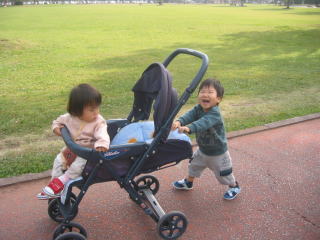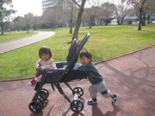 | こうちゃんがそらちゃんのベビーカーを押しています。それまで抱っこをせがんでいたのに、押してみたらって言ったら喜んで押して歩きました。 | |
