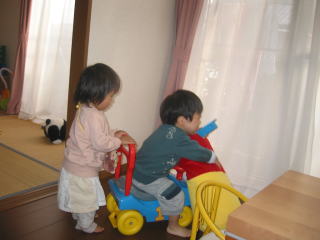 | ん???あべこべじゃん!そらちゃんはまだ1歳なのに、こうちゃんを押してる!?実ははじめそらちゃんが一人で車を押して遊んでいたんです。そこにこうちゃんがさりげなく乗ったってことなんです。でもおかしくてそらちゃんママと大笑いしました。 |