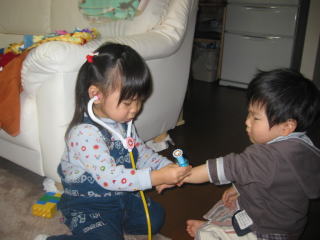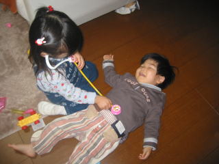 | 久しぶりにりおちゃんと遊びました。お医者さんごっこをしています。こうちゃんはなぜか?患者さんになりたがります(笑)。 | |