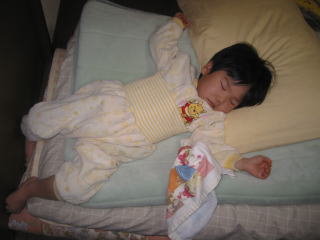| たくさん遊んで疲れたのか、布団を敷く前にたたんだ布団の上で寝ちゃいました。 |