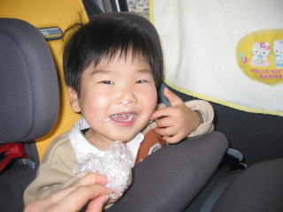 | 今から宗像のじいじとばあばの家にいきまーす!まずはおにぎりで腹ごしらえ。 | |