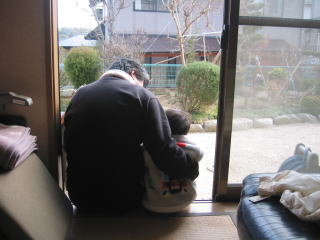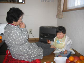 | ばあばと干し柿を食べています。こうちゃんは初めて食べる干し柿です。 | |