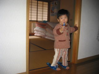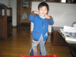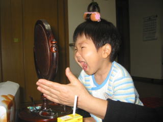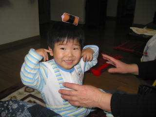 | ばあばが頭にカーラーを巻いていたら、「こうちゃんも海苔巻きしてー」って。どう?サザエさんみたい? | |