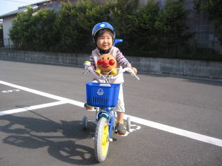 | 5月5日、こどもの日にじいじとばあばから自転車を買ってもらいました。まだ全然こげないんだけどね! | |